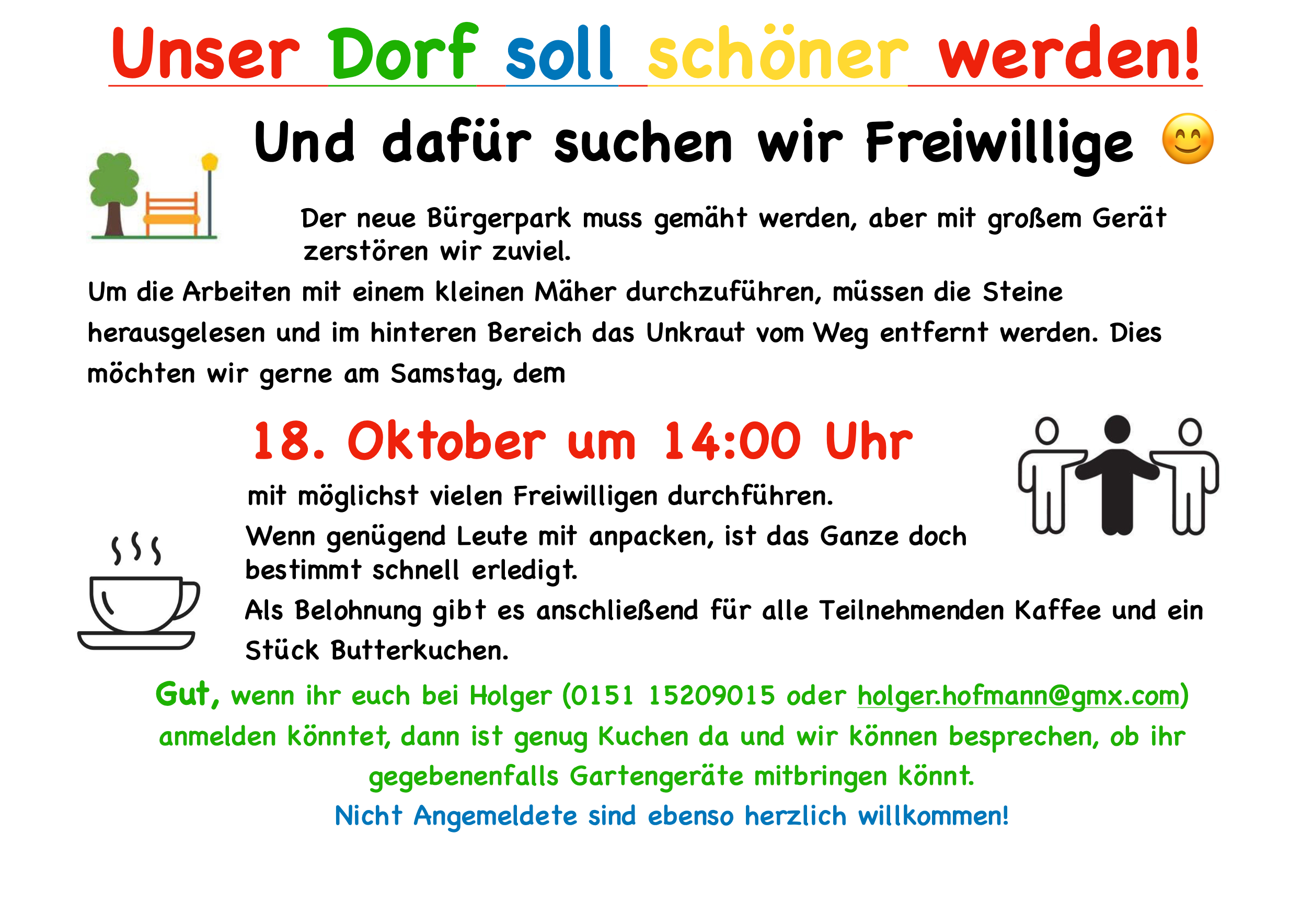 mit möglichst vielen Freiwilligen durchführen. Wenn genügend Leute mit anpacken, ist das Ganze doch bestimmt schnell erledigt. Als Belohnung gibt es anschließend für alle Teilnehmenden Kaffee und ein Stück Butterkuchen.